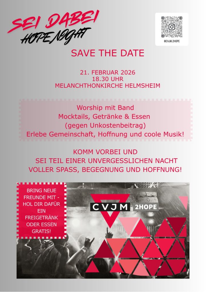 Am 21.02.2026 ab 18.30 Uhr wollen wir gemeinsam einen Abend voller Hoffnung, Gemeinschaft, Musik und guter Impulse in der Melanchthonkirche Helmsheim erleben.