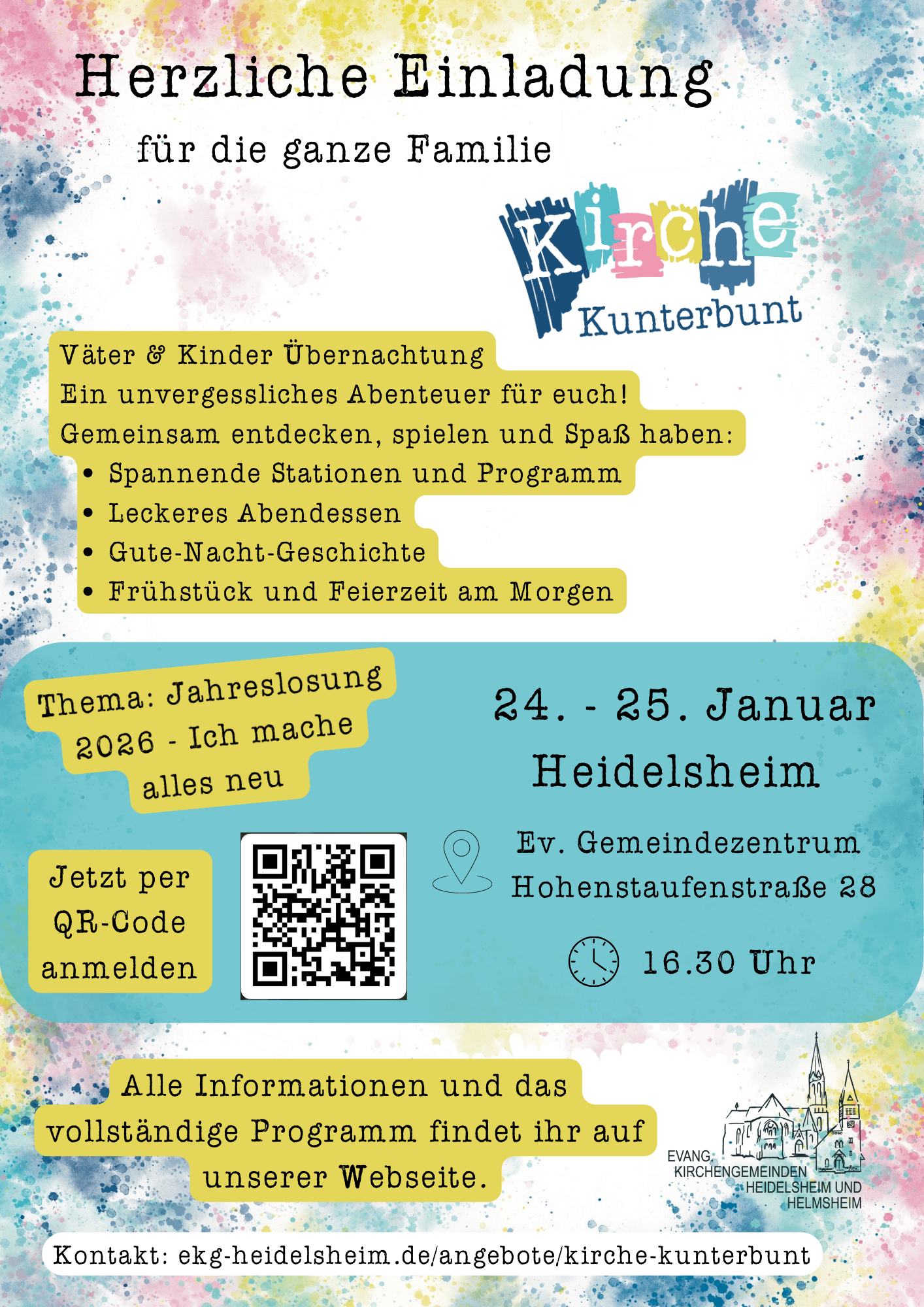 Am Samstag, den 24.01.2025, laden wir herzlich ein zu einer besonderen Kirche Kunterbunt mit Übernachtung im Evangelischen Gemeindezentrum Heidelsheim, Hohenstaufenstr. 28.