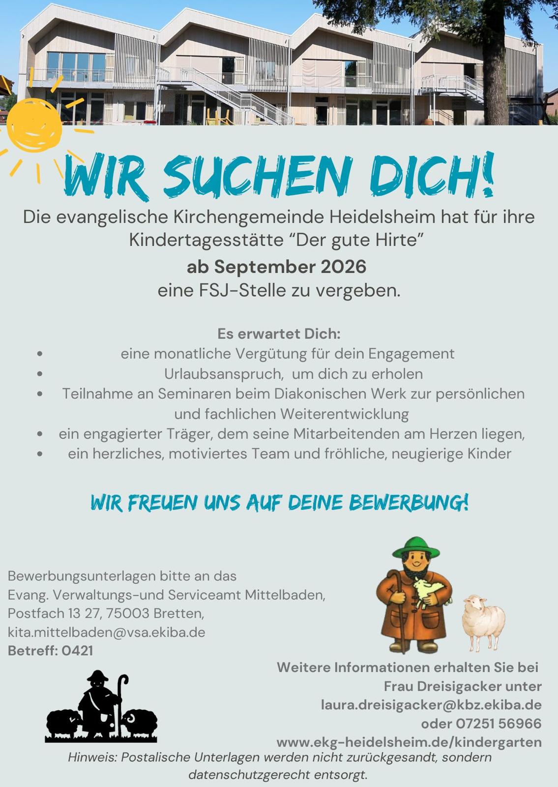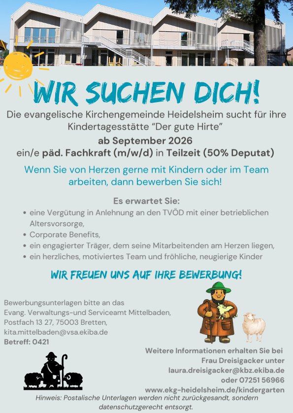 Die evangelische Kindertagesstätte „Der gute Hirte“ ist seit September 2023 im neugebauten Gebäude in der Hohenstaufenstraße zu finden. Hier können bis zu 120 Kinder im Alter von 1 bis 6 Jahren betreut werden.